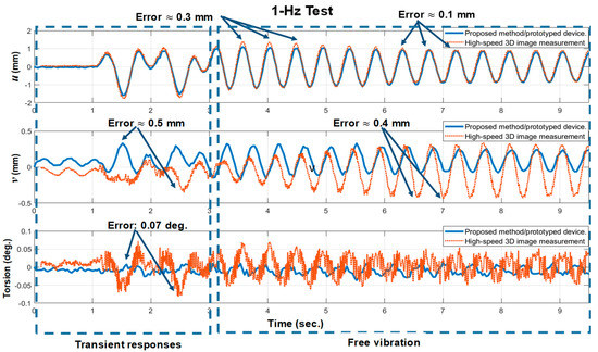 The measured responses are shown in Figure 7 for the 1-Hz test, where the inter-story responses are relatively small. The displacement of u is ±1.8 mm, while the displacement of v is ±0.4 mm, and the torsion is even smaller at ±0.08 degrees. Comparing the differences between the responses measured by the proposed method/prototyped device and the industrial 3D image measurement, the maximum displacement errors along u and v observed in these tests are within ±0.3 mm and ±0.5 mm, respectively. The error along u gradually reduced to 0.1 mm during the later period of the steady state response. The displacement v resulted in larger errors than u mainly because it is along the depth direction of the camera, which is the direction that a typical camera has little sensitivity. If the error along the depth direction does not meet the requirement, more than one camera could be considered. The description is added in the revised manuscript.