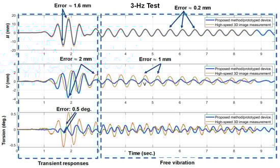 In the 3-Hz test (Figure 8), the inter-story responses are almost ten times larger than those in the 1-Hz test, mainly because the excitation is closer to the natural frequency of the specimen (i.e., 2.2 Hz). The observed natural frequencies generally matched its numerical modal analysis. Along the u-direction, the inter-story drifts reached maximum amplitudes of 4.32% (i.e., the ratio of 17.3 mm to 400 mm) and −3.93% (i.e., the ratio of −15.7 mm to 400 mm) in the transient state (from 0 to 3 s), and gradually remained at a 4.5-mm amplitude in the steady state (after 4 s). The differences between the responses measured by the proposed method/prototyped device and the industrial 3D image measurement are up to 0.5% (i.e., the ratio of 2 mm to 400 mm) at major peaks in transient responses and approximately 0.13% (i.e., the ratio of 0.5 mm to 400 mm) during the steady state response. Along the v-direction, in addition to an error larger than 0.5% (i.e., the ratio of 2 mm to 400 mm), a phase difference is also observed.