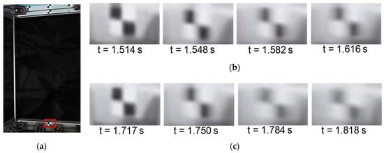 In both tests, image blurs can be observed in the photos taken by the prototyped device due to the rapid movement of the tracking points. The image blurs are especially significant in the 3-Hz test when the relative velocities of the tracking points are high. Figure 9 shows example images of one of the tracking points on the lower floor (indicated by a red box in Figure 9a). The images shown in Figure 9b,c are a sub-region of the photos. At time t = 1.514 s when the relative displacement u just went through a peak, the tracking point is clearly visible in the photo. Within only three image frames (approximately 0.1 s), the image became significantly blurred (Figure 9b). The image became clear again at the negative peak, yet when going back to positive from negative, the images once again became blurred. While Figure 9 shows two relatively severe cases, the image blurring occurred in almost every cycle of motion during the transient responses. While the point tracking technique is now typically capable of positioning a target in image with an accuracy as small as 0.02 to 0.03 pixels in crystal clear images (references), image blur would significantly reduce the accuracy. Reducing the exposure time of the camera could reduce image blur to improve the point tracking accuracy. Using strong environmental lights or adopting a camera with high low-light sensitivity can help reduce the exposure time of the camera, and thus further reduce the blur due to fast movement.