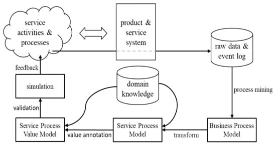 The scientific contribution of this paper was to propose a new service process modeling method. From raw data and event logs to business process model, which was inspired by Van der Aalst, then generating the service process model, and service process value model, our proposition that is completely new. The research on the actual service process execution in the product and service system is more meaningful. Although the model proposed in this paper is conceptual, it provides a framework for future work. For the follow-up research work, the first step is to improve the measurement indicators of service value, each parameter in value “V = (vts, vp, ve)” is a set of indicators, and then we want to define a standard log format through these indicators; the second is to adjust the mining algorithm used, such as the heuristic algorithm or inductive algorithm, and develop a generic Prom plug-in to validate our ideas, which will be applicable to other scenarios. Moreover, since different services may have different forms of value, it is difficult to give a set of indicators for the value of services in different fields. We will continue to focus on the service value in the product and service system. In addition, we may carry out in-depth research on the service process value model in combination with value chain theory.