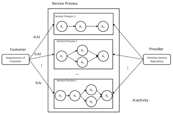 Service systems use processes and activities that differ from a business process. Processes and activities cover a full range of situations that might involve highly structured workflows and flexible processes, the sequence and content of which depend on the skills, experience, and judgment of the primary actors [37]. As mentioned in Section 2.1, SLA is the guarantee of the service provider to provide service for customers. Under the constraint of the SLA, the candidate primitive services in the repository for each service can be divided into different service sets, and the service process and activities matching the requirements of the customer can be constructed quickly. Customer requirements are the driving force of a service system, and services, including processes and activities, are dynamically constructed. As shown in Figure 2, for customer service requirements with the same function and different SLAs, the provider will select different primitive services from the service repository to form different service processes and activities. Usually, a primitive service is used to complete an activity in the service process, and there is a one-to-one relationship between them. When a process contains a sub-process, the sub-process can be regarded as an activity of the parent process, and the service used to implement the sub-process may be a primitive service or complex service. Since the structure of the parent process and sub-process are consistent, we can ignore the sub-process and treat it as an activity. For example, if a customer wants to send a package to a destination, taking the postage and delivery time as SLA parameters, the delivery time will be longer if the price is lower. Then, for a low postage package, a vehicle should be used to transfer it from one station to another station until it reaches the destination; for a high postage package, for the package with high postage, air transfer should be used to reduce the delivery time. From the perspective of the customer, what he wants is a complete service, and he does not care about the service process and activities. Therefore, if the customer pays $5, the package should arrive at the destination within 5 days; if the customer pays $10, then the package should arrive at the destination within 3 days. From the perspective of the service provider, they need to understand the whole service process and activities, and the appropriate primitive services should be selected to complete the corresponding activities or tasks, which may be the provider’s own or outsourced to other participants. So in order to deliver the customer’s package to the destination, the service provider may use a logistics company’s vehicle to transport the package from one place to another until it arrives at the destination; it may also rent space on an aircraft flight to transport the package to the destination.