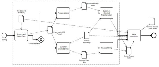 Through the traditional modeling method, we can build the service process model by observing the service process and activities in the service process, and by combining them with domain knowledge, manually or using modeling tools. However, the service process obtained in this way is relatively rough and may be different from the actual implementation of the service process. The observation is not accurate enough, and many hidden details may not be obtained through observation. To describe the model more accurately, we use a method based on process mining to build the service process. Normally, many raw data and event logs related to services are stored in the information system. If there are enough traces in the event log, the process and activities obtained by process mining will cover a full range of situations. As shown in the dotted box in Figure 3, there are two ways to build service process using process mining, based on raw data and event logs: one is from the business process model (BPM) to the service process model (SPM); the other is from the enriched event log to the service process model.