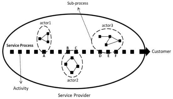 The similarity between service process and business process is that there are not only strict sequence restrictions among activities, but also the contents, methods, and responsibilities of activities must be clearly arranged and defined, so that the activities in process can be transferred between different actors. An activity in a business process, and a service process, can represent a sub-process, and the process can be nested. Business process is generally used to describe the collaborative production process of products, while service process describes how to deliver services to customers, to meet their requirements. Therefore, business process is product-oriented, and service process is customer-oriented. However, with the gradual evolution of servitization, the differentiation between products and services is increasingly blurring [38]. Lusch [32] argued that products can be seen as service distribution or provisioning mechanisms. Based on Banerjee’s argument of “everything as a service” [39], we further argue that the production process of a product can be a service process, or a part of a service process, the difference lies in whether it is customer-oriented. Hereby, if the business process is customer-oriented, it can be a service process, otherwise it is part of the service process.