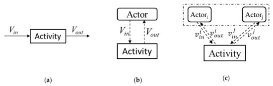Activity is the basic unit of the service process, which completes the specific task in the service. Activity is also the basic unit of value creation in the service. If an activity does not generate value, then it does not need to exist in the service process. As shown in Figure 6a, from the perspective of only one actor in the service, each activity has an input value and an output value. Vin represents the input value of the activity, and Vout represents the output value of the activity. In normal circumstances, the output value of an activity should be greater than the input. However, there are also exceptions, such as in the production process, the probability of waste products is inevitable, so the value generated by a certain activity is less than the input value. As mentioned in Section 3.2.1, the value of activity may be tangible, intangible, or both. Therefore, we can use the time and space, profit, and experience dimensions to express each specific value, whether it is input value or output value.