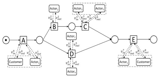 As shown in Figure 8, this is the general form of the service process value model. There are five activities and six actors in the model. The first activity is A, which is completed by two actors, that of the Customer and Actor1. We used a dashed box to enclose the Customer and Actor1 to indicate that they are working together to complete the activity. Since the customer’s service requirement is the trigger of the process, we put the Customer in front of Actor1. Both the Customer and Actor1 have input and output value in the activity. Activity B is completed only by Actor2 and activity C is completed by Actor3 and Actor5 together. Activity D can be performed by Actor2 or Actor4, which is not cooperative, but alternative. Finally, the service needs to be delivered to the customer, so activity E needs to be completed by Actor5 and the Customer together. Since the customer is the receiver of the service, we put the Customer after Actor5. The service process starts from the customer’s service demand and ends at the service delivery to the customer. Every activity in the service process is involved in value creation.