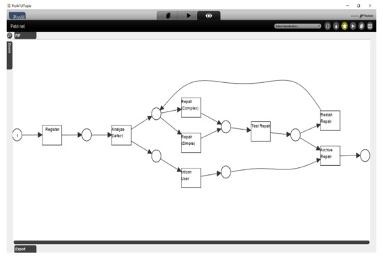 From the tutorial in reference [36], we know that teach trace in the event log represents a specific process instance, which starts with an activity to register the telephone, and ends with an activity to archive the instance. By using the α-algorithm plug-in for ProM to mine the running instance, the business process model, as shown in Figure 9, can be obtained. The first activity of the process is “Register”, which means registering the telephone sent by the user. The next activity is “Analyze Defect”, which means analyzing the defect category of the phone. Once the defect category is determined, it needs to be told to the customer through the “Inform User” activity, and according to the defect category, the “Repair(Simple)” activity or “Repair(Complex)”, activity on the phone will be carried out. After the repair work is finished, the phone must go through the “Test Repair” activity to determine whether it has been actually fixed. If the telephone is fixed, the instance is archived through the “Archive Repair” activity and the telephone is sent to the customer; otherwise, the “Restart Repair” activity will be launched and the telephone needs to be repaired again.