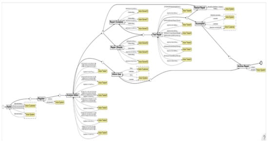 Through the above operations, the process is changed to being triggered by the customer, and the delivery of service becomes part of the process. We can now get the service process model, as shown in Figure 10. The customer’s demand for a telephone repair service can be met through the implementation of this service process. In the service process, in addition to “Apply” and “Accomplish” activities, there is another activity “Inform User”, which should also involve the customer. As the object of the notification is the customer, the customer will receive the result of the defect analysis from the company.