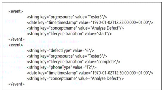After getting all the actors, we need to find out their input value and output value for the corresponding activities. Since there are not many attributes related to value in the running example, we cannot describe all dimensions of value completely, but we need to extract the value of at least one dimension from the running instance or supplement it with domain knowledge. For the “Apply” activity, since it is an activity added according to the domain knowledge, there is no information about it in the running example, so we need to add value information, according to the actual situation. In the “Apply” activity, the “Customer” needs to tell the “System” the characteristics of the telephone defect. The “System” receives the information from the customer and needs to give the customer a service number and mailing address. Here we assume that there are six kinds of defect characteristics of the telephone [E1, E2, E3, E4, E5, E6]. Then the input value of the “Customer” is = (cid, , [E1, E2, E3, E4, E5, E6]), and the output value is = ((serviceid, address), , ); the input value of “System” is = ((serviceid, address), , ), and the output value is = (cid, , [E1, E2, E3, E4, E5, E6]). Here, cid represents the customer number, and sid represents the service number. Since each specific service instance faces different customers, each specific cid and sid are different. We abstractly use cid and sid to represent them. The customer can query the progress or status of service through sid. For the “Analyze Defect” activity, we can extract the value of actors from the corresponding events in the running example. Figure 12 shows specific “Analyze Defect” activity information in a service instance. From the information, we can find that the participant of the activity is “Tester3”, the start time is “1970-01-02T12:23:00.000+01:00”, the end time is “1970-01-02T12:30:00.000+01:00”, and the analysis result shows that the type of phone is T2 and the defect type is 6. Hereby, in this specific activity instance, the actor “Tester3” spent a certain amount of time to get the analysis results, then his input value is time, and the analysis result is his output value. Therefore, from the perspective of model, the value of each actor in activity “Analyze Defect” needs to be calculated for all instances. We can get that the input value of each actor, which is = (avgTime, , ), and the output value is = ((phoneType, [num_defectType1,…, num_defectTypen]),... ], , ). Here, avgTime represents the average time spent by the actor; (phoneType, [num_defectType1, …, num_defectTypen]) represents the collection of the numbers of defect types that occur on the phoneType. The new plug-in developed for ProM to extract actors can also be used to extract value information from the running examples.