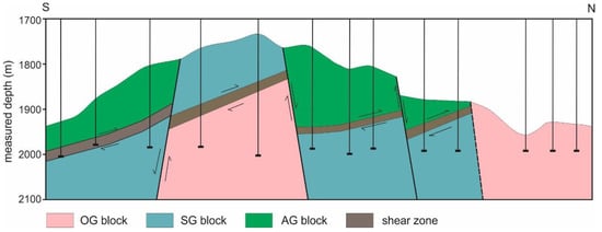 The brittle deformed character of all these zones is also demonstrated by the core material. The zone at a depth of ~2075 m is a thick (~5 m) fault breccia zone, while the layer at ~2065 m is not brecciated but falls into numerous thin layers separated by an intensively fractured host rock. The behaviour of the zone at ~2052 m is more contradictory. Based on the well-log evaluation, the zone appears as a brecciated layer, while the cores indicate an intensively fractured host rock. A comparison of this well-log pattern (Figure 8) with those identified in the neighbouring wells (not presented) reveals a similar appearance in all wells North of A-1. These comparison wells exclusively penetrate the rocks of the AG block and reveal the sheared zones inside the tens-of-metre-thick amphibolite sequence. Nevertheless, the wells to the South penetrated only a massive amphibolite. As previous studies [,] have revealed, the presence of an SG block can be inferred below the AG block, separated by wide (~10–20 m) fault zones throughout the Szeghalom Dome. Such an arrangement suggests that the shear zones inside the AG block can be spatially extended and have a south-dipping position parallel to the major thrust sheet that separates it from the underlying SG block. Wells both to the East and West also have rocks of SG and OG blocks below the AG block. In harmony with the structural evolution of the area [,,], these regions represent elevated horsts separated by normal faults from an AG-dominated block between them (Figure 14). Based on their position and lithological characteristics, the brecciated amphibolite layers in the A-1 well and its neighbouring wells can be assumed to relate to the overthrust zone between the SG and AG blocks at smaller scales. From this viewpoint, the structures revealed by the A-1 well can be interpreted as minor fault zones accompanying the larger fault zone within the hanging wall (i.e., AG block).