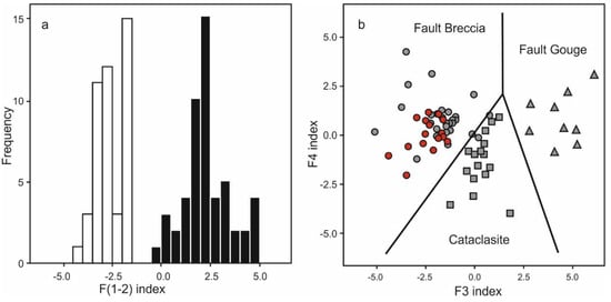 Discriminant functions to distinguish (a) undeformed host rock (white bars) from fault rocks (black bars) and (b) fault breccia, cataclasite and gouge based on the discriminant functions F(1-2), F3 and F4 calculated using Discriminant Function Analysis on well-log data from the Szeghalom area (modified after []). Red dots denote the fault rocks of the studied A-1 well.
