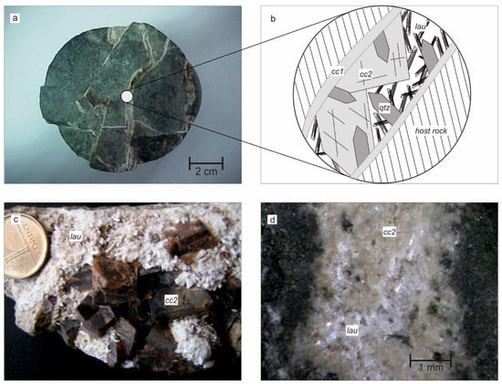 Typical vein-filling mineralogy of the amphibolite. (a) Representative fractured amphibolite bore core. (b) Sketch of the vein-filling mineral sequence. (c) Open vein with brown calcite2 and laumontite. The coin is 16 mm in diameter. (d) Vein filled by calcite2 and laumontite.
