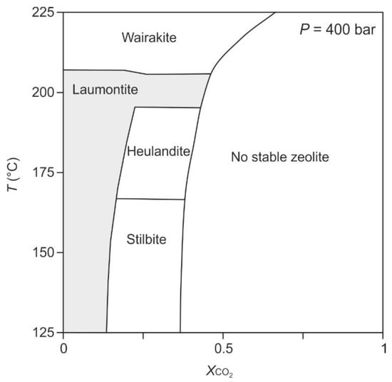 To understand the conditions under which potential laumontite-bearing parageneses might be formed, a mineral assemblage that sufficiently mimics the vein composition was chosen. In particular, the behaviour of the theoretical 10 calcite + 6 kaolinite + 3 quartz mineral composition was modelled. We used the THERIAK-DOMINO software for modelling in the T-XCO2 field [,], with a temperature of 125 °C < T < 225 °C and a fixed pressure of P = 400 bars. The CO2 concentration changed from 0 to being oversaturated. The results indicated that zeolite could not appear at high (>0.5) XCO2 fluid compositions. Stilbite and heulandite appeared under moderate XCO2 levels, while wairakite was stable at T > 210 °C. The narrow field in which laumontite became stable was at a low temperature (<200 °C) and extremely low XCO2 levels (<0.15; Figure 7). The reaction calcite + kaolinite + quartz + H2O = laumontite + CO2 may be responsible for laumontite formation in the veins.