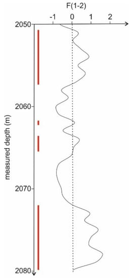 Vertical variation in the F(1-2) values along the A-1 well. The dashed line separates the undeformed host rock from the faulty rocks (Figure 4a). Red bars indicate the possibly deformed intervals.