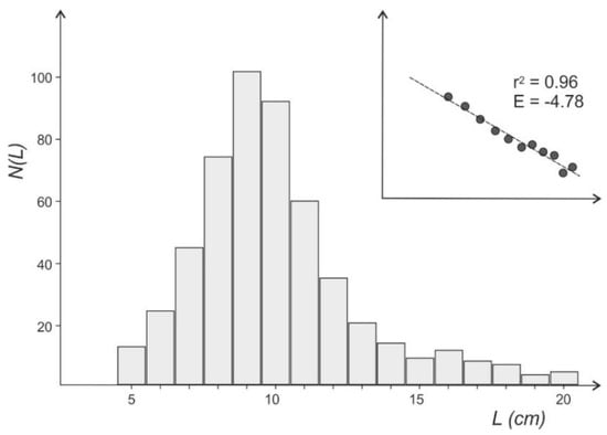 Fracture length distribution measured along the A-1 well. Inset: the logL − logN(L) plot of the histogram for estimating the length exponent E.