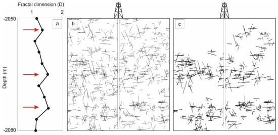 Representative fracture network model. (a) Fractal dimension (D) log. Red arrows denote the intervals with high fracture density. (b) Representative vertical section of the total fracture network around the A-1 well. (c) Communicating part of the same fracture network.