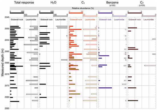 In both sample sets, whenever C7 hydrocarbons are present, an exponentially decreasing pattern characterises the C2+ hydrocarbon range (Figure 12b). Based on the characteristic fragmentation of the hydrocarbons (e.g., []), the obtained mass spectra indicate the contribution of higher-carbon-numbered hydrocarbons to the recorded spectra. The aromatic hydrocarbons benzene and toluene are also present in relatively great abundance (Figure 12c and Figure 13). The contribution of benzene to the FiCs signal is almost constant, with some fluctuations in case of the laumontite samples. In contrast, three intervals in the sidewall rock samples are richer in benzene, and these zones overlap with the corresponding maximum loci detected in the laumontite (Figure 13). The assumed composition of hydrocarbons (C7+ and aromatics) indicates the presence of gas condensate or liquid hydrocarbons (e.g., light oil; []) in the fluid remnants trapped in the samples. This presumption is consistent with the American Petroleum Institute (API) gravities of the oils produced in the research area [], indicating that the explored zones were not only active during ancient fluid conduction but also part of a more recent hydrocarbon system.