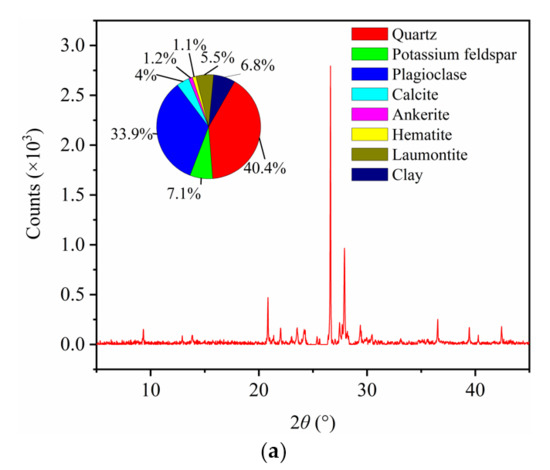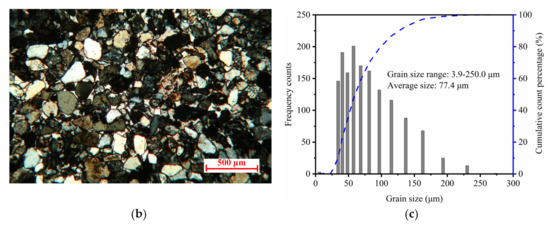 A red sandstone block with uniform texture is selected to make cylindrical specimens. The diameter and height of each specimen are 50 mm and 100 mm, respectively. The primary mineralogical components of the red sandstone are feldspar and quartz, and the average grain size is 77.4 μm (Figure 1). After being dried naturally in the room temperature, the average density of the specimen is 2.39 g/cm3. In total, 78 specimens are prepared for test, among which three specimens, numbered 1# to 3#, are used for the uniaxial compressive strength (UCS) test. The average UCS of the specimen (σc) is found to be 62.80 MPa. The other 75 specimens are for UCLU tests.