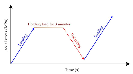 We conducted the UCLU tests by using various prescribed stress levels in the 1st loading cycle (σA) and loading strain rates (lsr). Figure 3 illustrates the loading path of the UCLU test. The test is performed in two steps. With the stress-controlled loading mode, σA is first increased at a loading speed of 1.0 MPa/s, and σA is prescribed from 0.5σc to 0.9σc at an increment of 0.1σc, respectively. The load is kept for 3 min so that the influence of AEs generated by friction and slippage between the microstructural surfaces inside the rock is eliminated [22,23,29,30,31]. Then the specimen is unloaded to 0.5 MPa at an unloading speed of 1.0 MPa/s. To guarantee full contact between the loading platen and the rock specimen end, the stress is not completely unloaded to zero. This prevents an unfavorable effect generated by the separation of the loading platen from the end face. To avoid that the test is stopped due to unexpected and quick rupture of the rock specimen under the loading mode of stress-control, the displacement-controlled loading mode is used in the 2nd loading stage, and the loading strain rates (lsr) are 10−5 s−1 to 10−3 s−1, which falls into the region of strain rate from low to medium [18,32,33]. The detailed experimental schemes of the UCLU refer to Table 1.