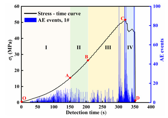Figure 4 illustrates the AE evolution of the UCS test of the red sandstone. The AE evolution is characterized by four stages, including quiet stage (OA), transition stage (AB), active stage (BC), and attenuation stage (CD), corresponding to the four stages of the stress-strain curve, namely, compaction stage, elastic stage, yield stage (stable crack growth and unstable cracking, respectively), and failure stage. In the quiet stage (I), the original microcracks and fissures within the rock specimen are closed upon the stress appliance. The friction between microcracks leads to low-energy, low-quantity AE events (abbreviated as AEs hereafter) with high variations. The stress acting on the rock specimen in the transition stage (II) is insufficiently high to develop new microcracks, whereas some closed microcracks slip, generating some low-energy AEs. In the active stage (III), yielding occurs, and the microcracks are continuously produced and developed with increasing volumetric strain and dilatancy. AE commences activation and the AE number grows. In the attenuation stage (IV), microcracks are interconnected, resulting in the formation of macroscopic ruptures. AE becomes extremely active and the number of AEs peaks. Over the rapid stress drop, the AE number gradually reduces.