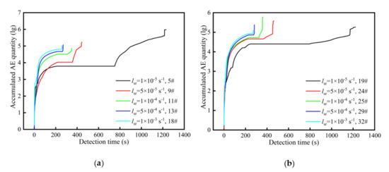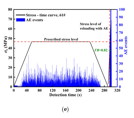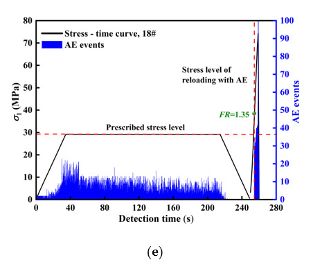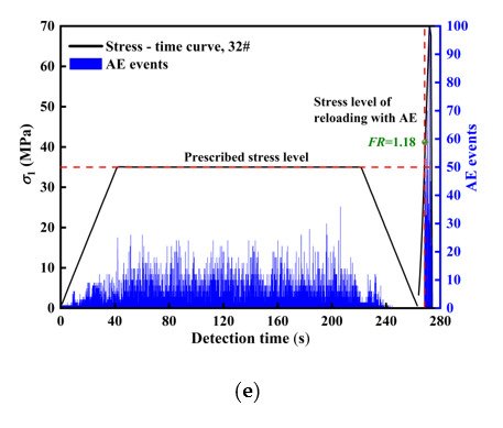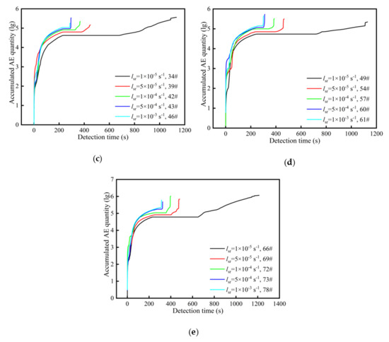 AE curves of the UCLU tests when σA = 0.7σc: (a) lsr = 10−5 s−1; (b) lsr = 5 × 10−5 s−1; (c) lsr = 10−4 s−1; (d) lsr = 5 × 10−4 s−1; (e) lsr = 10−3 s−1.