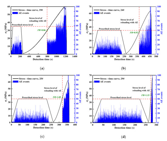 Substantial experiments have shown that the rock Kaiser effect can breakdown or disappear over the cyclic loading process [21,22,34]. The Felicity effect occurs when the Kaiser effect vanishes. The Felicity effect, which is also termed the counter-Kaiser effect, denotes that AEs start to appear noticeably when the applied stress is lower than its highest value of the stress history in the previous stage [21,34]. The Felicity effect is quantifiable by the Felicity ratio (FR), which usually represents the degree of rock damage. As the FR is decreased, the rock damage degree becomes higher. Given that the FR is larger than 1.0, the Kaiser effect is pronounced and the rock damage degree is low or even no damage. When FR < 1.0, the Kaiser effect disappears, which indicates remarkable damage due to unstable crack expansion. The Felicity ratio (FR) is measured by the stress magnitude of the Kaiser effect (σAE) and the highest stress in the previous loading stage (σm):