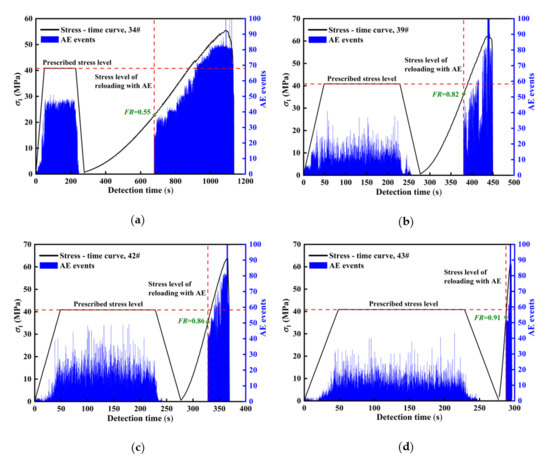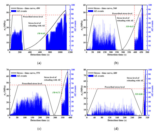 Figure 10a demonstrates that when σA = 0.5σc, i.e., the prescribed stress is located in the region of the compaction stage to the elastic stage, AEs appear extensively if the stress is larger than σA, and the Kaiser effect is obvious. When FR > 1.0 in the re-loading stage, the Kaiser effect occurs, and the loading strain rate poses a minor impact on the Kaiser effect. Once σA arrives at 0.6σc, i.e., in the region of the elastic stage and the stable crack expansion stage, the appearance of the Kaiser effect is strongly related to the loading strain rate. When FR < 1.0 and lsr < 10−4 s−1, the Felicity effect appears in the re-loading stage and the Kaiser effect disappears. When FR > 1.0 and lsr ≥ 10−4 s−1, the Kaiser effect appears over the re-loading. When σA ≥ 0.7σc, i.e., ranging from the stable crack growth stage to the unstable cracking stage, for FR < 1.0, substantial AE events happen at the low loading stress level. That is to say, the Kaiser effect vanishes, accompanied with the occurrence of the Felicity effect. The loading strain rate has nearly no impact on the Kaiser effect. Therefore, the Kaiser effect and the Felicity effect are greatly influenced by the prescribed stress (σA). For the same type of rock, different σA under the same loading path result in different damage degrees of rock, and thus, different AE characteristics. Overall, the mechanical properties of the rock degrade as σA increases. As the internal damage degree gradually increases, more AEs are generated earlier. Consequently, as the Kaiser effect breaks down, the Felicity effect emerges.