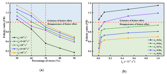 Figure 10b shows that when the loading strain rate grows from 10−5 s−1 to 10−3 s−1, the FR increases from 1.06, 0.86, 0.56, 0.46, and 0.37, to 1.35, 1.19, 0.94, 0.81, and 0.70 under σA = 0.5σc, σA = 0.6σc, σA = 0.7σc, σA = 0.8σc, and σA = 0.9σc with the increased proportion of 27.36%, 38.37%, 67.86%, 76.09%, and 89.19%, respectively. Taking σA = 0.5σc for example, the FR increases from 1.06 to 1.21 with the increased proportion of 21.00% as the loading strain rate increases from 10−5 s−1 to 10−4 s−1. When the loading strain rate grows to 10−4 s−1, the FR increases to 1.35 with an increased proportion of 11.57%. That is to say, the FR increases as the loading strain rate increases. The Kaiser effect easily appears, and how the loading strain rate influences the Kaiser effect is greatly affected by σA. Moreover, the loading strain rate significantly affects FR when lsr < 10−4 s−1. The FR rapidly increases as the loading strain rate increases. When lsr ≥ 10−4 s−1, the loading strain rate has a minor influence on the FR.
