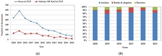 Publications featuring the use of plant-growth-promoting (PGP) microorganisms: (a) in stressful conditions and, particularly, salinity for the last 10 years; (b) distribution of publications by type of document, including, in particular, salinity. Source: Scopus; search parameters: “stress” AND “plant growth-promoting”; “salinity” OR “NaCl” AND “plant growth-promoting”. The search was performed in August 2020.