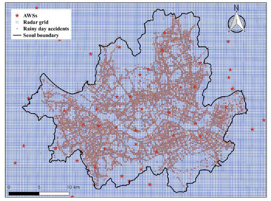 Locations of selected traffic accidents on rainy days, April to October 2008–2017; automatic weather stations (AWSs); and weather radar grid in Seoul.