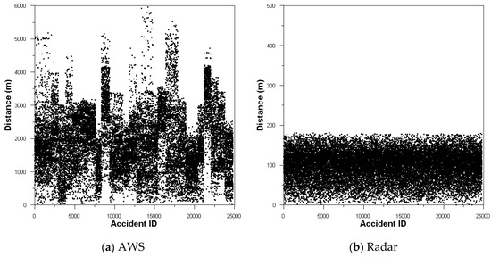 Based on the number of traffic accidents that occurred under rainy conditions (24,797), the distance between the traffic accident location and closest point of each rainfall data source (radar grid point and AWS) was analyzed. The results are shown in Table 1 and Figure 2. Accident location and rainfall observation points did not directly match because of spatial differences. In Figure 2, the Accident IDs were sorted according to the nearest AWS and the high-resolution radar grid point. As shown in Table 1, the minimum distance between the traffic accident point and the AWSs location is 16 m, and the maximum distance is 5956 m. On average, AWSs are 1886 m from the accident site. The minimum, maximum, and average distances to the radar grid point are 1, 183, and approximately 99 m, respectively. Clearly, the use of AWS locations to assess accident-causing rainfall phenomena is not reliable given the range of distances involved, whereas the high-resolution radar ensures that any given accident location is no more than 183 m from a rainfall data point, resulting in much higher accuracy.