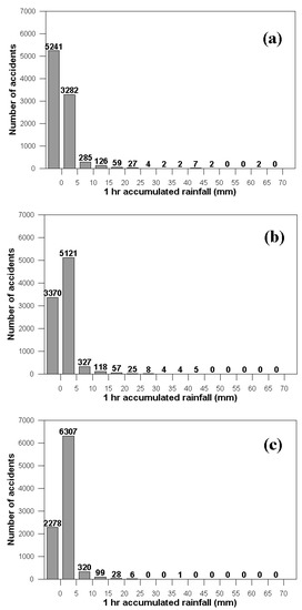Number of accidents during 1 h accumulated rainfall measured by (a) rain gauges nearest to the accident location, (b) distributed rain gauges, and (c) radar.