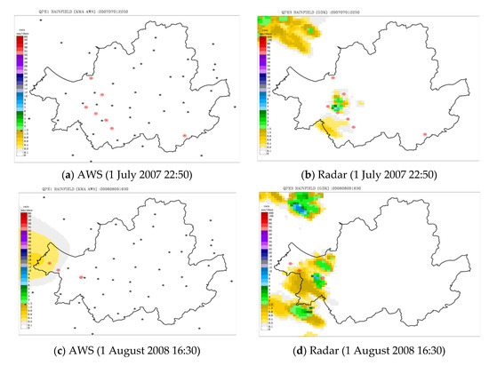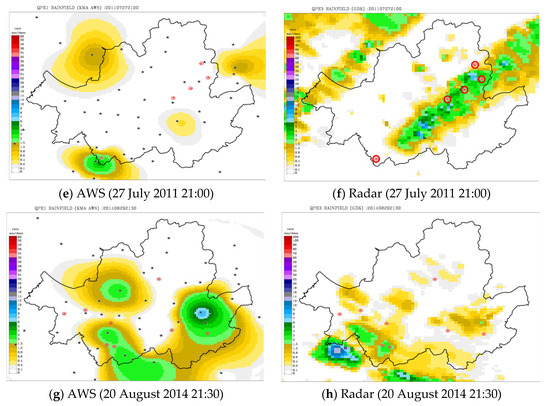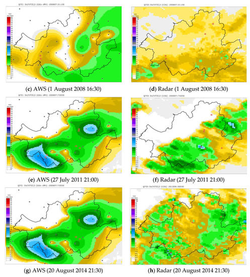 - Yoon, S.; Phuong, A.T.; Bae, D. Quantitative comparison of the spatial distribution of radar and gauge rainfall data. J. Hydrometeor. 2012, 13, 1939–1953. [Google Scholar] [CrossRef]
