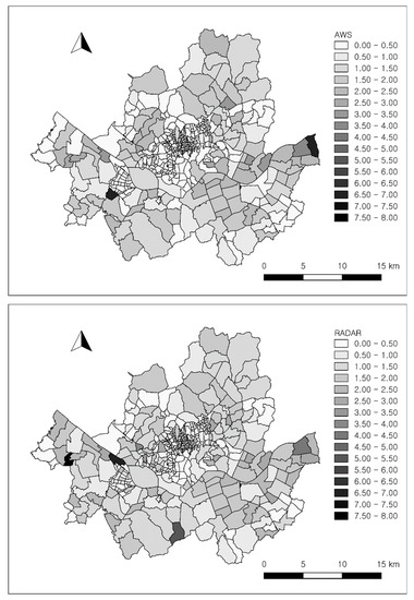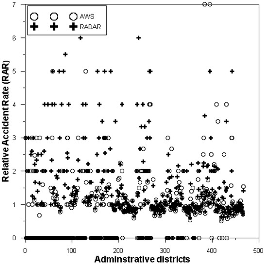 The RAR was estimated to quantitatively analyze the effects of rainfall data sources on the relationship between rainfall and traffic accidents. RAR analysis was based on accident-causing rainfall, without considering specific rainfall criteria or range. The wet and dry hours of Equation (1) to calculate the RAR were estimated using the data one week before and after each accident during the rainfall condition. The RAR was calculated for 467 administrative districts in Seoul using the interpolated AWS and radar-derived data to produce an average RAR of 1.35 and 1.59, respectively (Figure 7). Because the radar better captures the spatial distribution of rainfall, the number of traffic accidents due to rainfall was counted more accurately. For fatal and severe accidents, the RAR was 1.49 using gauge (AWS) data and 1.63 using radar data (Figure 8).