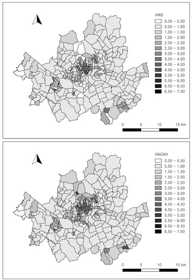 Previous studies investigating the effects of rainfall on accidents have focused on urban areas [9,15] because global urbanization is increasing the relative importance of cities. Improved vehicle design and driver training have reduced weather-related accident rates in developed countries in recent decades, but urbanization and rising occurrences of extreme rainfall events have led to the need for more effective approaches to analyzing the links between rainfall and accidents [7,16,17]. For example, Jaroszweski and McNamara [18] compared the relative accident rate (RAR) for precipitation events using both radar-derived and gauge-based rainfall data for two urban areas in the United Kingdom, finding that the former approach was far superior. RAR values vary based on rain data sources. Although many studies have assessed the cause-and-effect relationship between traffic accidents and rainfall, few have used such time-based high-resolution radar data, especially to analyze changes in the frequency of traffic accidents due to differences in spatial rainfall distribution within urban areas. In this study, we analyzed the relationship between rainfall and traffic accident rates in Seoul, South Korea, using the gauge- and radar-derived rainfall data to assess the influence of the type of rainfall data used on the spatial distribution of traffic accident patterns.