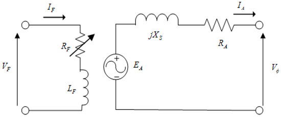 Synchronous generators were used to transform mechanical energy into electrical energy. In a synchronous generator, the magnetic field is built by supplying DC current to the rotor. When the rotor is operating, the induced voltage is produced in the stator. Figure 3 shows a circuit diagram for a synchronous generator.