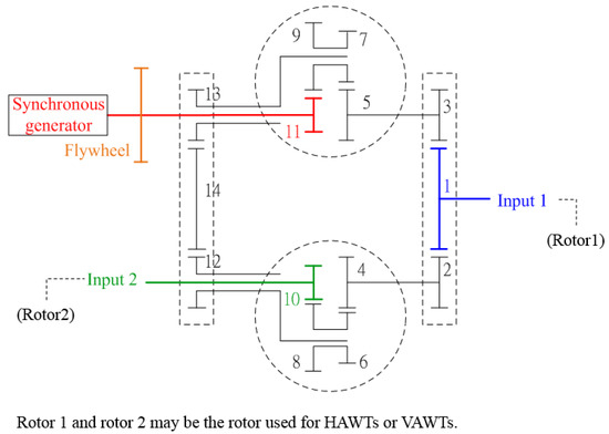 A dual-input transmission mechanism is proposed for small turbine systems. The dual input transmission mechanism features two sets of planetary gear trains and a variable inertia flywheel for the analysis in this paper. Based on the conservation of energy, neglecting the loss of gear trains, the proposed system is capable of accepting the two rotors rotating in different directions and integrates the energy flows for the generator. However, in real situations, the transmission trains may use gears and/or other mechanical elements to build the proposed system, avoiding the wind interaction between the two rotors. Moreover, as shown in Figure 5, the rotor and the input axis may be separated as individual elements and connected by the belt for the power transmission, which produces the feasibility for a real installation case. In addition, in this study, a variable magnetic flux controlled by the synchronous generator is used to stabilize system responses, especially at startup. Numerical results show that the integration of the dual inputs can improve the turbine system’s performance, and the variable inertia flywheel stabilizes system responses. As stated in reference [16], the commercial small wind turbines have their real power output less than the nominal power. As the battery module is introduced for the purpose of energy storage for the SWT system, the combination of two rotor inputs can increase the power input, which may create a high voltage output for real application. With the proposed model, it gives the manufacturers of SWTs the idea to improve the performance of SWTs by the variations of mechanical mechanism, which enable the integration of energy flows. In conclusion, the proposed model is shown to provide a feasible solution for improving wind turbine performance.