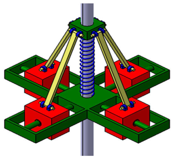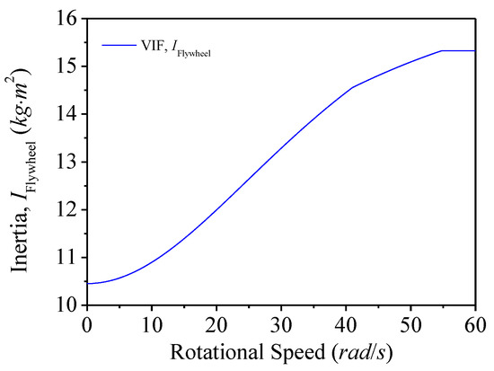 where is the radius of gyration, is the length of the linkage, is the spring constant, is the original length of the spring, is the mass of the sliding block, and is the angular speed of the flywheel. For the proposed flywheel mechanism, the inertia of the flywheel increases with the angular speed.