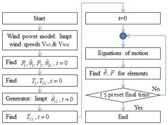 In reality, wind speed varies over time. For application in a small wind turbine system, the wind speed variation must fall within an acceptable range. In our simulation, the cut-in wind speed must be large enough to start the wind turbine system. At that moment, the dual input transmission mechanism begins to drive the synchronous generator. When the cut-out wind speed is reached, the mechanism will trip out to protect the synchronous generator. Thus, the operating wind speed must lie between the cut-in and cut-out wind speeds. The wind speed is sampled once every ten minutes. The Runge–Kutta method is used to simulate the small wind turbine system and the computational algorithm is shown in Figure 7.