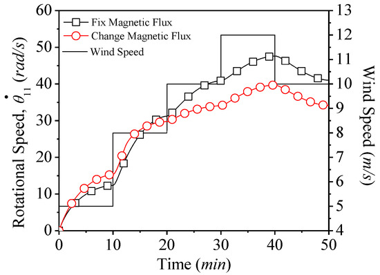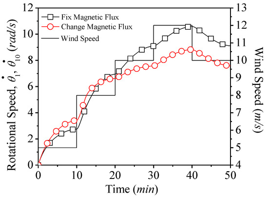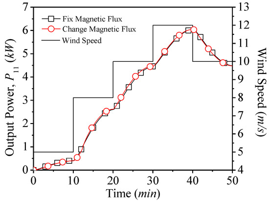 As shown in Figure 10, the wind speed assumes a step-like form, and the corresponding output powers are presented for constant and variable magnetic flux cases. It is found that the output power varies little in cases of constant and variable magnetic flux. At the starting of the wind turbine system, the wind speed is about 4 m/s.