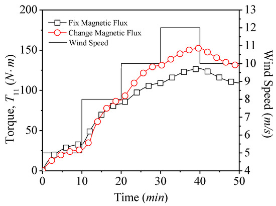For a wind turbine system, the induced output torque is influenced by the magnetic flux of the rotor. In particular, in low winds, the input power will fail to produce enough output torque to drive the generator. In this study, the synchronous generator is capable of controlling the magnetic flux, which can be expressed in terms of a preset operating speed.