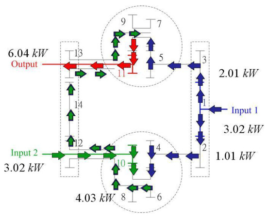Figure 15 shows the power flow for a wind speed of 9.5 m/s. In the case, two input powers of the proposed mechanism have the same value of 3.02 kW. At Input 1, the power splits as two branches of 2.01 kW and 1.01 kW for the upper and lower planetary gear trains, respectively. At the lower planetary gear train, a sub-total power of 4.03 kW flows into the upper planetary gear train, which gives the total output power of 6.04 kW. It is found that the dual inputs of wind power can be easily integrated for a single output by a feasible mechanical mechanism design, as the proposed system does.