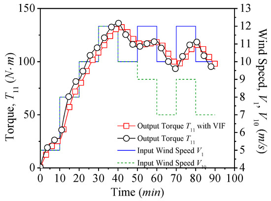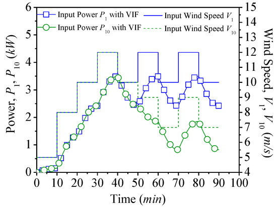 The design parameters for the variable inertial flywheel (VIF) must consider the range of the shaft’s angular speed. Figure 16 shows the inertia variation for the flywheel. As shown in Figure 17, different input powers are applied to the system. Figure 18, Figure 19 and Figure 20 respectively show the corresponding power, angular speed, and torque variations for the output shaft, presenting the responses of the systems with and without VIF. Figure 18, Figure 19 and Figure 20 also show that, although the inertia of the flywheel is not sufficiently high, the system with VIF (shown by red rectangles in the figures) trends to stabilize the system responses, unlike the system without VIF (shown by black circles in the figures). This may be attributed to the proposed flywheel mechanism, which can be used to adjust the energy state for the wind turbine system.
