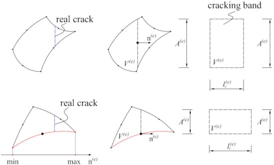 where the element-dependent parameter is obtained as , denotes the volume of element e and stands for the surface area of an equivalent crack parallel to the real crack. In fact, corresponds to the classic characteristic length [,]. Here, the determination of for the 8-node quadrilateral (Q8) and 6-node triangular (T6) elements is slightly different insofar as the equivalent crack passes through the center point of Q8 but through the midpoint of one edge of T6; see Figure 2. More details can be found in [,].