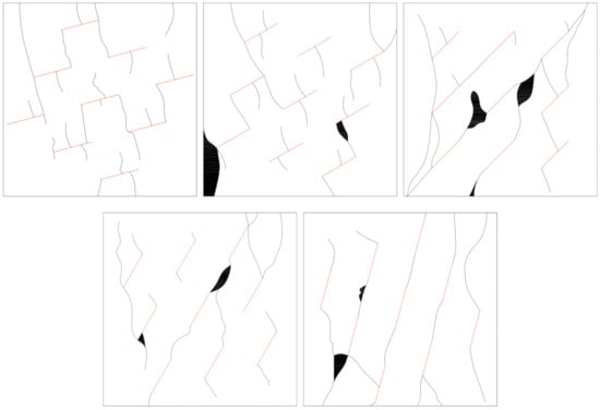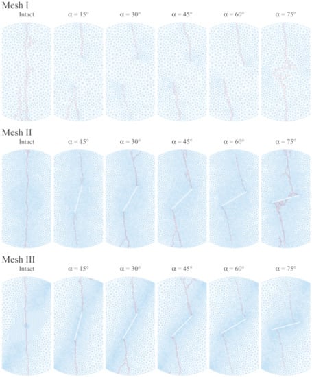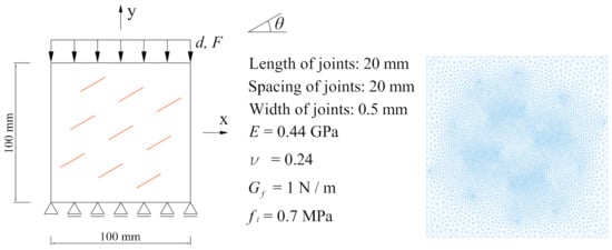 The last example concerns uniaxial compression tests of rock-like brittle materials with nine parallel fissures, which were experimentally studied in []. The model, material, and discretization are shown in Figure 17. Five cases with different values of are considered: , , , , and .