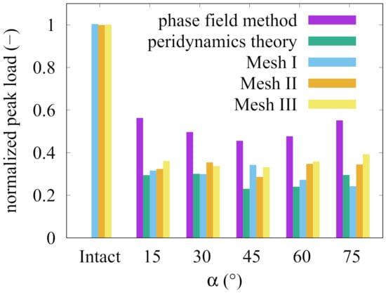 Brazilian disk tests: normalized peak loads compared to the results published in [] (obtained by the phase field method) and [] (by the bond-based peridynamics method).
