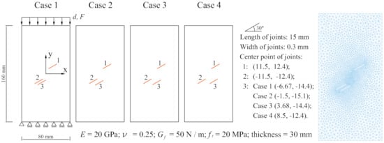 The third example concerns uniaxial compression tests on 3D-printed materials with two intermittent fissures, which were experimentally studied in []. The model, material, and discretization are shown in Figure 11, with fissures that are 0.3 mm in width. Only the elastic modulus, Poisson’s ratio, fracture energy, and uniaxial tensile strength are needed in our model.