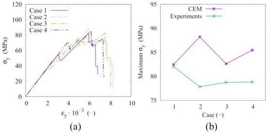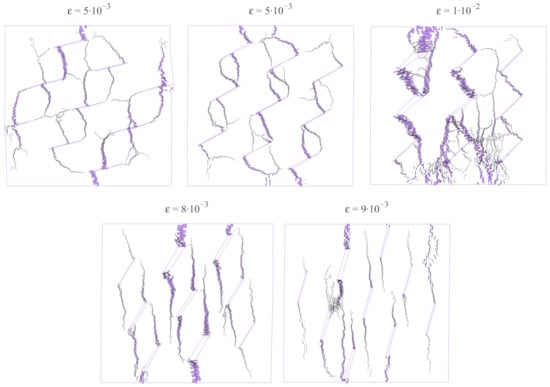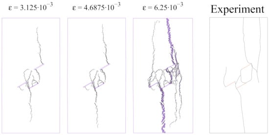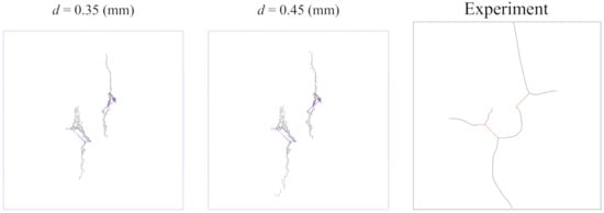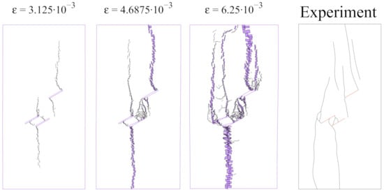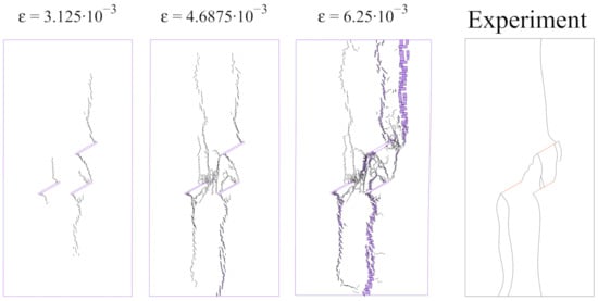 We compare only the numerically and experimentally obtained results of the crack opening (crack paths). The crack opening plots are shown in Figure 18. Comparing the experimental results shown in Figure 19, it can be found that the tensile-induced cracks are successfully captured by the CEM, including some branching and nucleation of the cracks. Especially for the cases with small values of , tensile damage dominates. However, some drawbacks of our model are indicated: