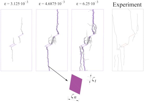 The force–displacement curves and the maximum vertical loads compared to the experimental results are shown in Figure 6. In the force–displacement curves, the oscillations correspond to the connecting of different fissures by propagating cracks. Furthermore, considering the maximum vertical loads, similar to the experimental results, we found that the position of fissure No. 3 has a limited influence on the maximum . The crack opening plots compared to the experimental results are shown in Figure 7, Figure 8, Figure 9 and Figure 10, where the small parallelograms represent the normal and shear crack opening, see Figure 7. The results indicate that the CEM is capable of simulating multiple crack propagations and connections among different fissures in the meanwhile the crack openings are obtained successfully.