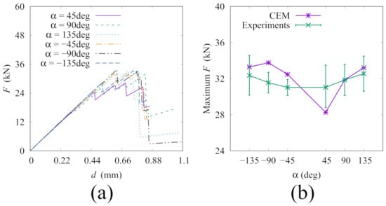 3D-printed materials with two intermittent fissures: (a) force–displacement curves and (b) maximum vertical loads compared to the experimental results provided in [].
