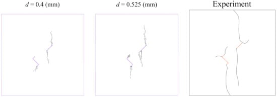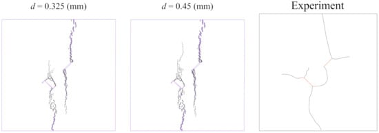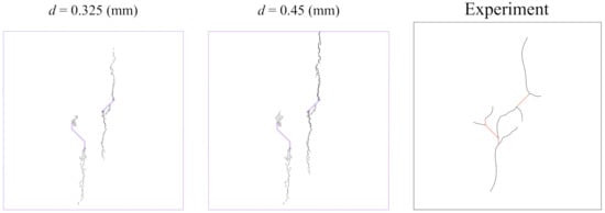 The force–displacement curves and the maximum vertical loads compared to the experimental results are shown in Figure 12. Generally, the numerically obtained results are satisfactory. Parts of the crack opening plots compared to the experimental results are shown in Figure 13, Figure 14, Figure 15 and Figure 16. In most cases in the simulations, the two fissures are not connected by the propagating cracks, which does not accord well with the experimental results. We attribute the differences to two reasons: (i) the shearing damage is not accounted for in the present model, and (ii) the free horizontal boundary conditions on the top and bottom of the specimens cannot be ensured in the experimental investigations.